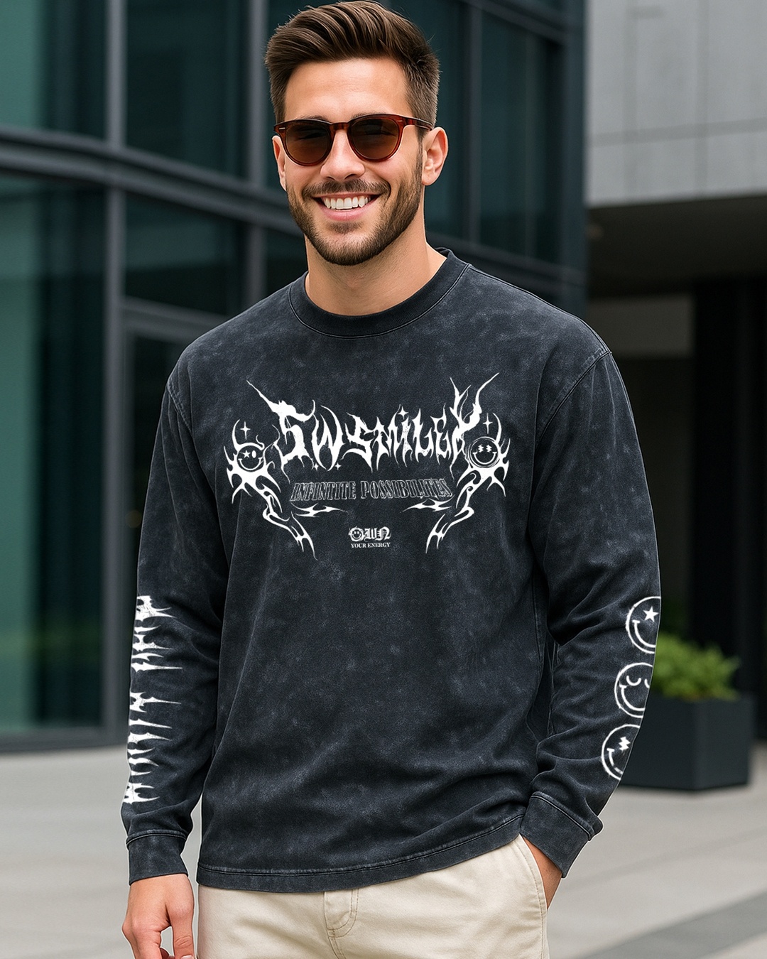 S.W.Smiley Men's Black Chaos Graphic Printed Oversized Acid Wash T-Shirt