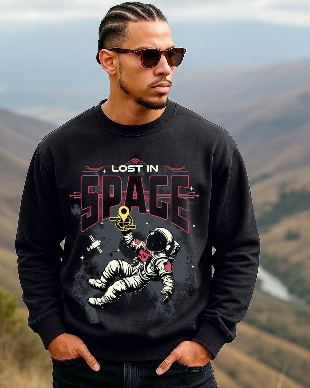 Men's Black Lost In Space Graphic Printed Oversized Sweatshirt