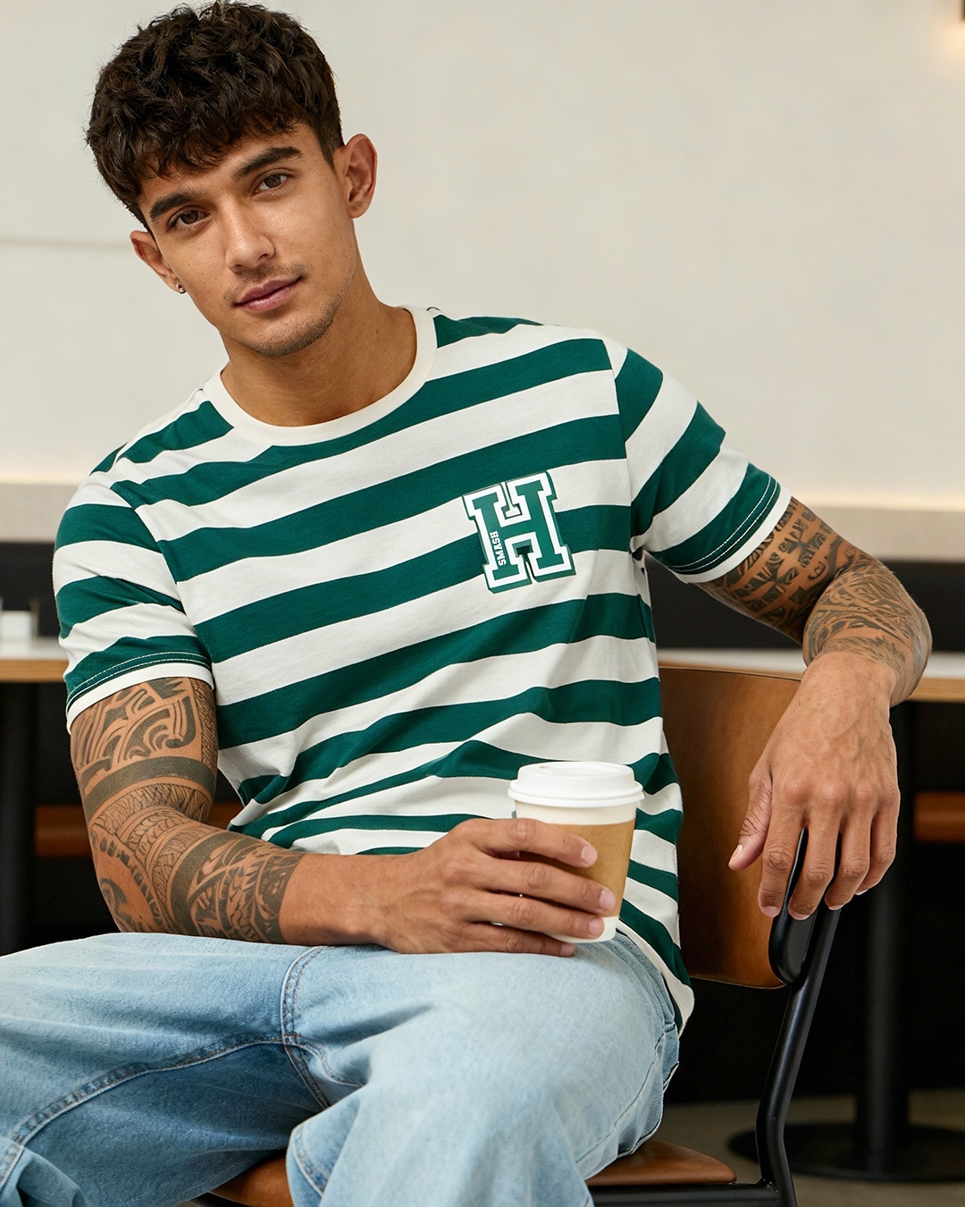 Men's Green & Off White Striped T-shirt