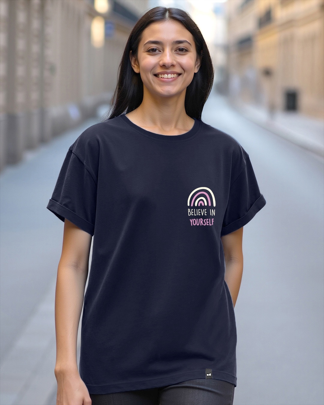 Women's Navy Blue Believe Graphic Printed Boyfriend T-shirt